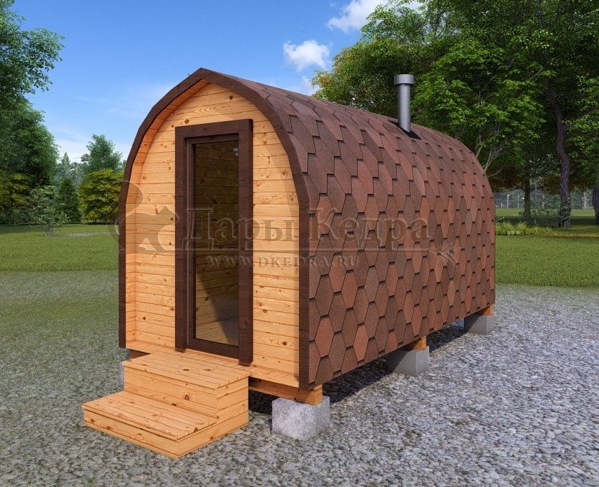 Баня-бочка буханка из кедра 4 метра Это более просторная модель за счет увеличенной высоты потолков и ровного пола. В такой модели раздевалка совмещена с моечной. Тут установлен душевой поддон, вешалка, полочка и лавочка из кедра. В парильном отделении по обе стороны расположены двухуровневые открытые полки, печь находится между ними у дальней стены. Время растопки такой бани не превышает 30 минут. По вашему желанию баню-бочку можно укомплектовать козырьком, верандой и печью с внешней загрузкой, благодаря которой весь мусор во время топки остается на улице. Баня-бочка буханка не требует полноценный фундамент, поэтому при необходимости ее можно перенести в другое место. Обращаем Ваше внимание, что в стандартную комплектацию бани входят полки открытого типа в парной с обеих сторон. Дополнительно можно заказать полок закрытого типа или лавку! Кедр обладает ароматическими свойствами. Он не деформируется и влагоустойчив, при правильном уходе за деревом на нем не развиваются грибки и плесень.