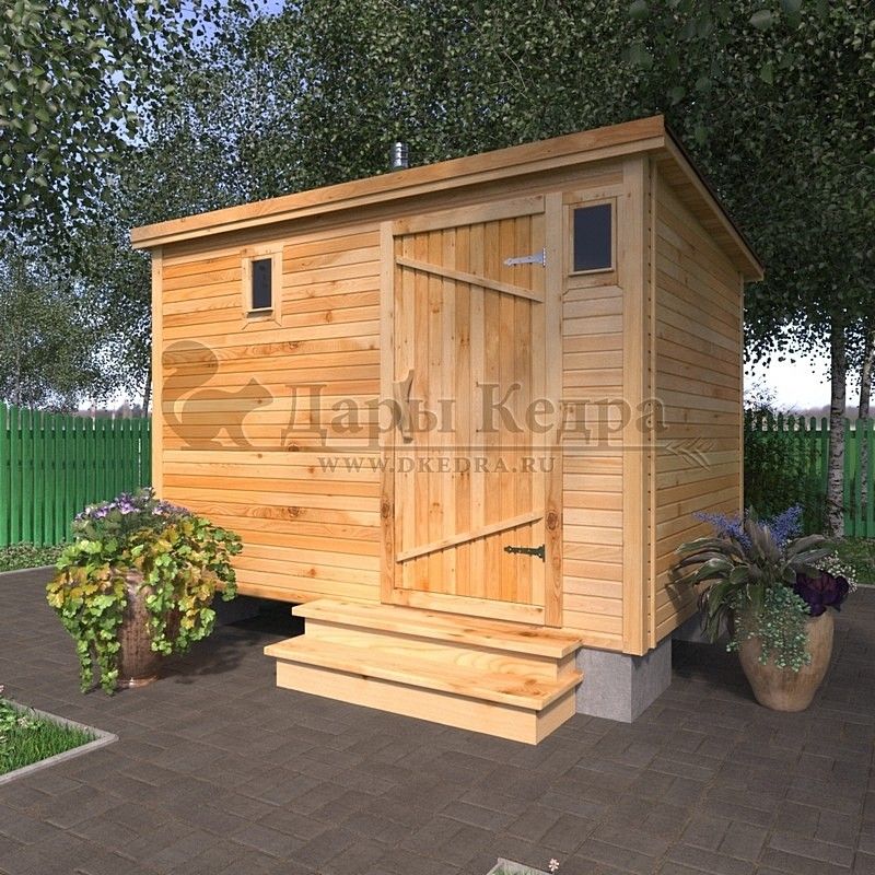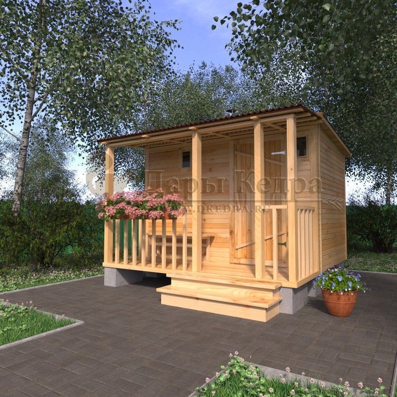 Каркасно-щитовая баня из кедра «Мини» с верандой Это классическая прямоугольная модель бани с двумя отделениями: парилкой и раздевалкой. Для удобства пользования раздевалка оснащена лавочкой и вешалкой. Парилка оборудована двухуровневым открытым полком и печью. За счет небольшой конструкции баня нагревается в течении 30 минут. На просторной веранде можно оставить вещи или отдохнуть после парения. Каркасно-щитовую баню можно заказать как в готовом, так и в разборном варианте. В разборной модели готовые щиты из кедра быстро собираются в полноценное строение, что также позволяет исключить лишний строительный мусор. Такая баня не требует полноценный фундамент, поэтому при необходимости ее можно перенести в другое место. Обращаем Ваше внимание, что в стандартную комплектацию бани входит полок открытого типа в парной. Дополнительно можно заказать полок закрытого типа или лавку! Древесина кедра насыщена эфирными маслами и фитонцидами, которые активируются при воздействии температур. Таким образом, парение в каркаско-щитовых банях из кедра становится еще полезнее.