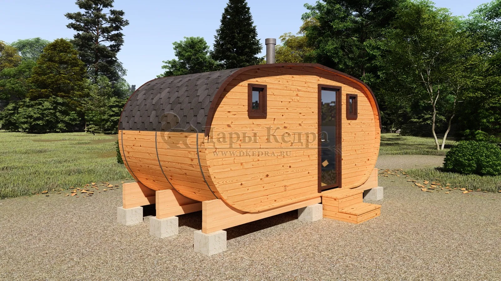 Баня-бочка буханка из кедра 3 метра Это более просторная модель за счет увеличенной высоты потолков и ровного пола. В такой модели раздевалка совмещена с моечной. Тут установлен душевой поддон, вешалка, полочка и лавочка из кедра. В парильном отделении по обе стороны расположены двухуровневые открытые полки, печь находится между ними у дальней стены. Время растопки такой бани не превышает 30 минут. По вашему желанию баню-бочку можно укомплектовать козырьком, верандой и печью с внешней загрузкой, благодаря которой весь мусор во время топки остается на улице. Баня-бочка буханка не требует полноценный фундамент, поэтому при необходимости ее можно перенести в другое место. Обращаем Ваше внимание, что в стандартную комплектацию бани входят полки открытого типа в парной с обеих сторон. Дополнительно можно заказать полок закрытого типа или лавку! Кедр обладает ароматическими свойствами. Он не деформируется и влагоустойчив, при правильном уходе за деревом на нем не развиваются грибки и плесень.
