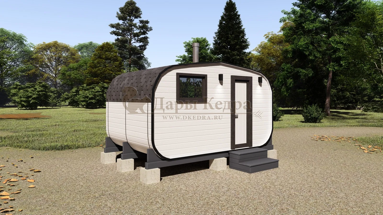 Рекомендуем устанавливать баню-бочку на свайное поле или ровную бетонную площадку. Это предотвратит перекос дверей и окон, а также продлит срок службы изделия.