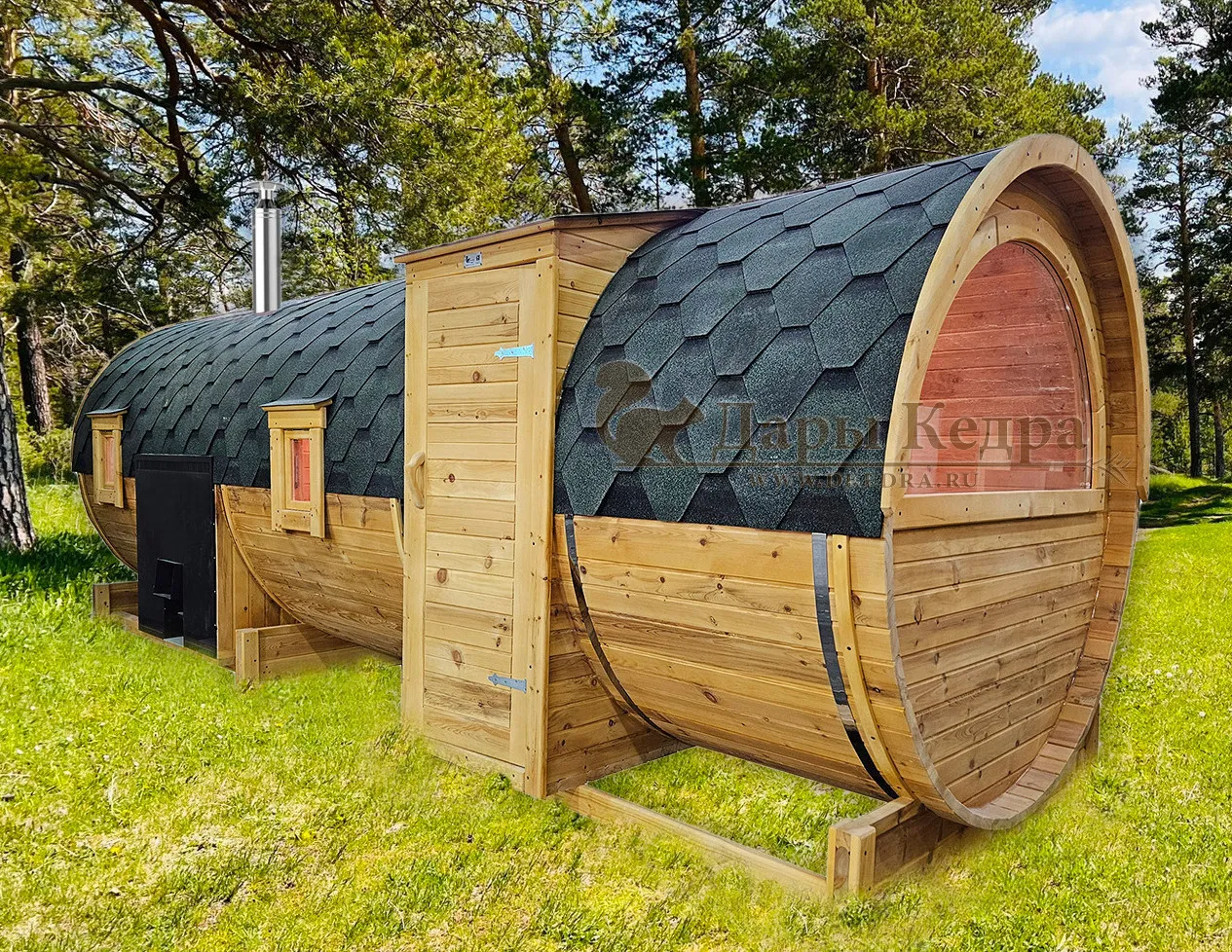 Баня-бочка круглая из кедра 3 метра Это изделие круглой вытянутой формы с двумя отделениями: раздевалкой и парной. Лавочки из кедра находятся по всей длине бани-бочки с обеих сторон. Печь расположена в парилке около дальней стены. Для удобства пользования в раздевалке установлена вешалка и полочка из кедра. За счет небольшой конструкции баня нагревается не более 30 минут. По вашему желанию баню-бочку можно дополнить печью с внешней загрузкой, благодаря которой весь мусор после топки останется на улице. Круглая баня-бочка не требует полноценный фундамент, поэтому при необходимости ее можно перенести в другое место. Обращаем Ваше внимание, что в стандартную комплектацию бани входят лавки в парной с обеих сторон. Дополнительно можно заказать полок открытого или закрытого типа! Кедр обладает ароматическими свойствами. Он не деформируется и влагоустойчив, при правильном уходе за деревом на нем не развиваются грибки и плесень.