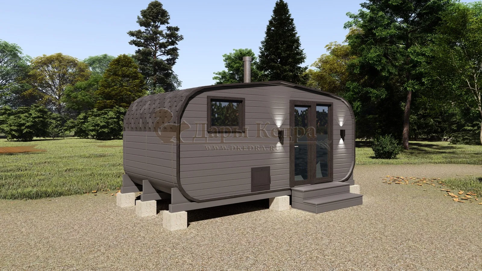 Баня-бочка «Орео» с боковым входом и панорамным окном Стильная и современная баня-бочка с боковым входом может быть выполнена длиною от 4 метров, что-бы было два отделения (парилка и комната отдыха). Полок может быть, как с двух сторон, так и угловой, в стандарте одноуровневый. Печь в данной модели расположена сбоку с топкой наружу, либо внутрь парилки. Печь можно укомплектовать баком для воды, а саму баню сделать длиною до 6 метров, комфортно разместив в ней дополнительно помывочную. В эту модель включено два закаленных стеклопакета: круглое и полукруг, которые мы можем разместить на ваше усмотрение в парилке и комнате отдыха. Обращаем Ваше внимание, по умолчанию в данной модели отсутствует бак для воды, вместо него идёт утеплённая термо-труба, которую можно заменить на бак по желанию.