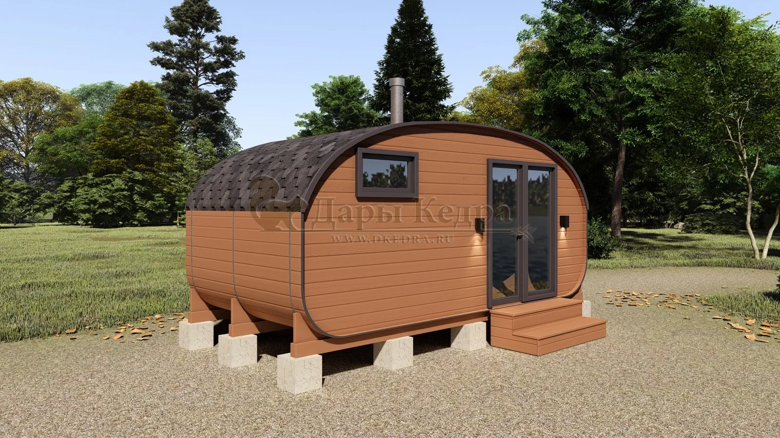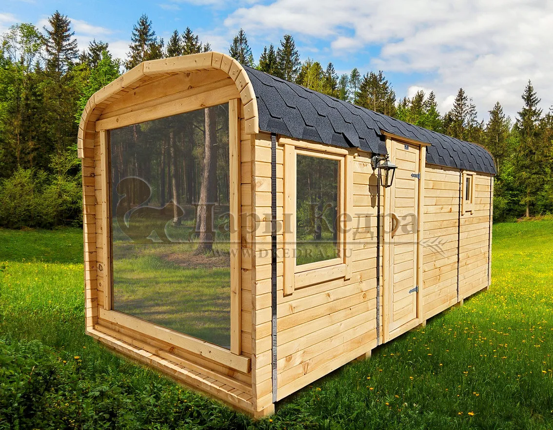 Симбиоз круглой и квадратной бани-бочки. Разработано с учётом эргономики, в ней так же просторно, как и в квадро-бочке, но при этом полукруглая крыша не дает задерживаться снегу и влаге на кровле. А еще такая баня безусловно красивая, мобильная и доступная каждому!