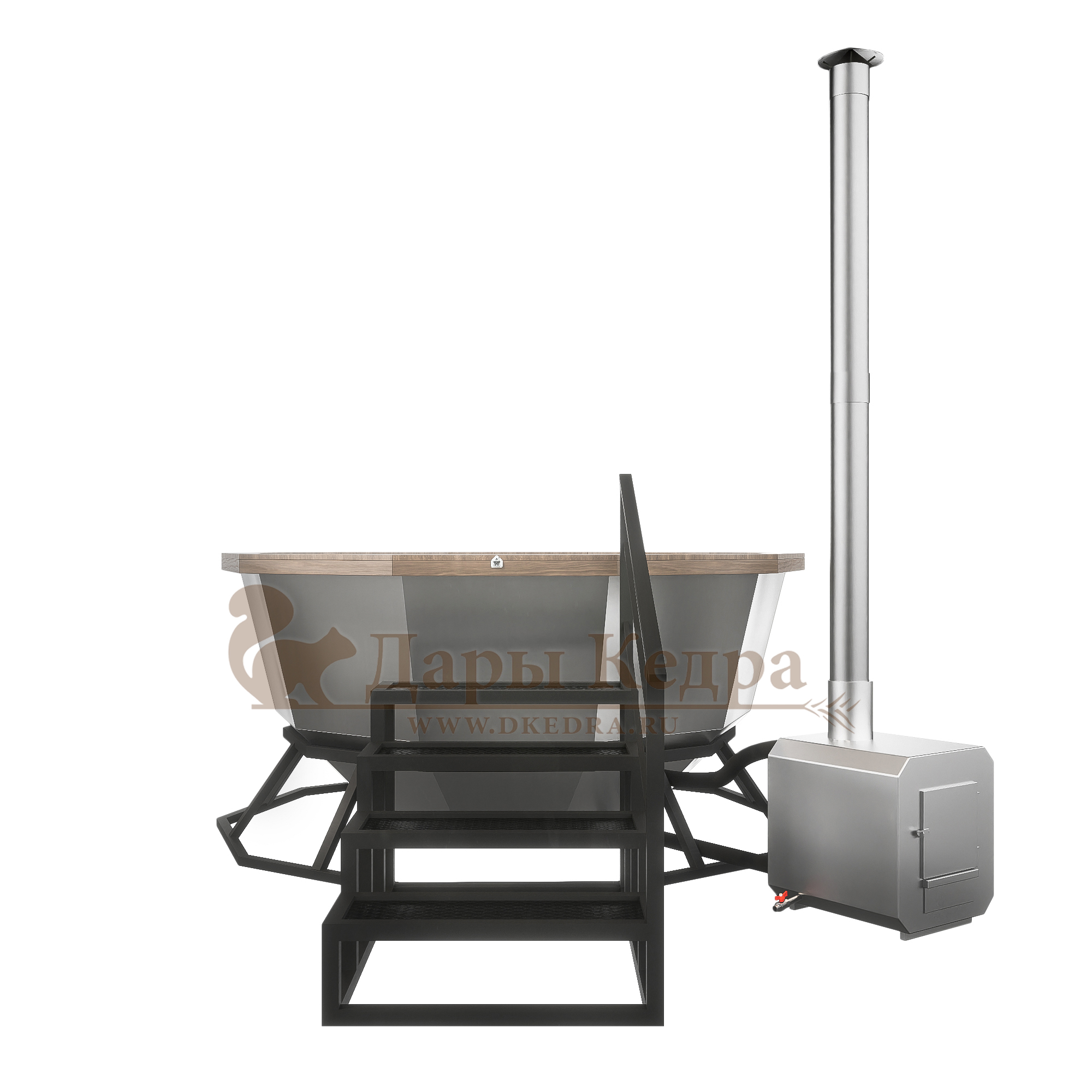 Банный чан из нержавеющей стали Ø-1750 на подставке с приставной печью Банный чан с приставной печкой изготовлен из пищевой стали. Представляет собой большую ёмкость в виде чаши, при нагревании которой можно париться на свежем воздухе. Чан установлен на устойчивую металлическую подставку и оснащен приставной печью с дымоходом. Банный чан оборудован кедровым бортом, скамейками, подспинниками, трапом для ног и приставной лестницей.
