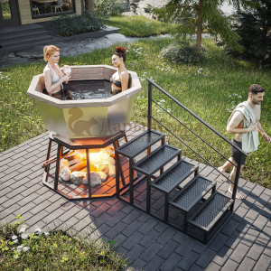 Банный чан на подставке изготовлен из пищевой стали. Представляет собой большую ёмкость в виде чаши, при нагревании которой можно париться на свежем воздухе. Чан установлен на устойчивую металлическую подставку и оборудован кедровым бортом, скамейками, подспинниками, трапом для ног и приставной лестницей. Нагревание банного чана происходит от обычного костра. Если оборудовать данную модель печью, то банные процедуры можно принимать даже зимой.