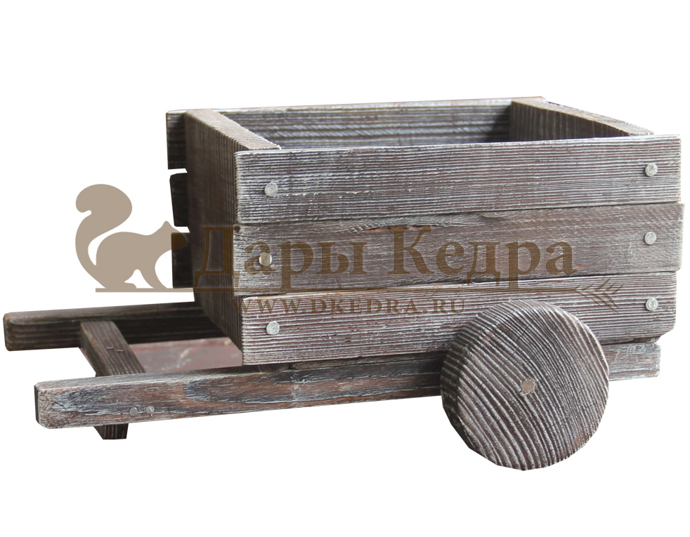 • Деревянная тележка Компания Дары Кедра изготавливает деревянные ящики, машинки, тачки, которые подойдут в качестве украшения любому интерьеру гостиной, кухни, детской комнаты. Они могут быть использованы в качестве конфетницы, вазы для фруктов, а также оригинальной упаковки подарка любимому человеку, ребенку, коллеге.