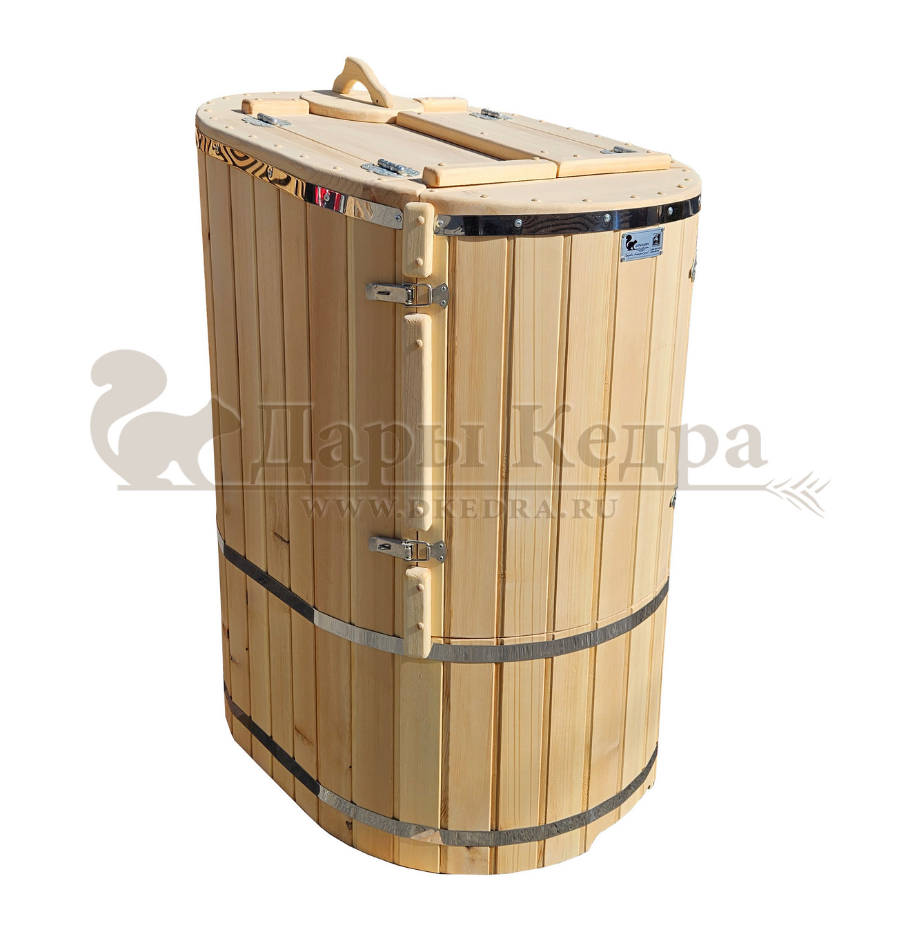 • Кедровая бочка (фитобочка) круглая «Классическая Эконом» Круглая фитобочка представляет собой мини парную, которую можно использовать не только в спа-салонах, но и дома. Бочка изготовлена из древесины кедра без отбора по сучкам, поэтому такая модель считается более доступной. Фитобочка оборудована откидными створками, дверцей и отверстием для головы. Во время парения человек сидит внутри кедровой бочки, а голова находится снаружи. Благодаря этому исключается возможность перегрева. Подлокотники из кедра, встроенные ручки на створках и двери делают эксплуатацию более удобной. Парение в фитобочке благотворно влияет на организм в целом: повышается иммунитет, выводятся шлаки и токсины, улучшается работа органов тела и состояние кожи.
