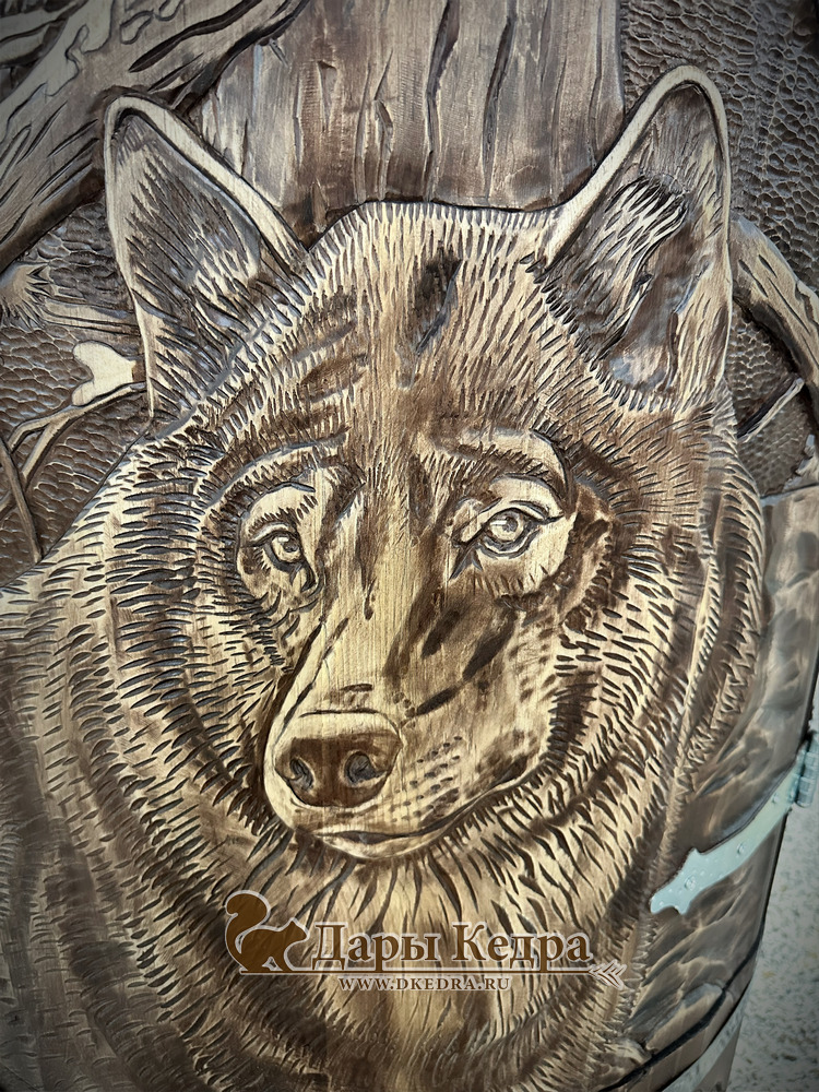 • Кедровая бочка (фитобочка) «Сибирский волк» Любая модель эксклюзивной фитобочки - это выбор не только дизайнеров и ценителей красоты, но и тех, кто любит нестандартный подход в любых деталях. С оригинальной авторской фитобочкой Дары Кедра ваша квартира, дом или салон красоты станут объектом всеобщего внимания, ведь такая фитобочка - это не просто смело, красиво и достойно, это еще и очень полезно для Вашего здоровья! Художественная резьба это ручная работа, выполняется разными мастерами и каждый рисунок неповторим. Вы можете выбрать предложенные варианты резьбы или подобрать изображение и мы предложим вам подходящий эскиз. На сайте представлены наши работы в качестве примера. Каждая резьба рассчитывается индивидуально и может быть нанесена на любую модель фитобочки. Эксклюзивная фитобочка может быть представлена в разной цветовой гамме: После того, как цвет фитобочки выбран, необходимо определиться с вариантом резьбы (или предложить свой): Фитобочку можно также декорировать канатной веревкой в места обручей из нержавеющей стали (оплачивается дополнительно).