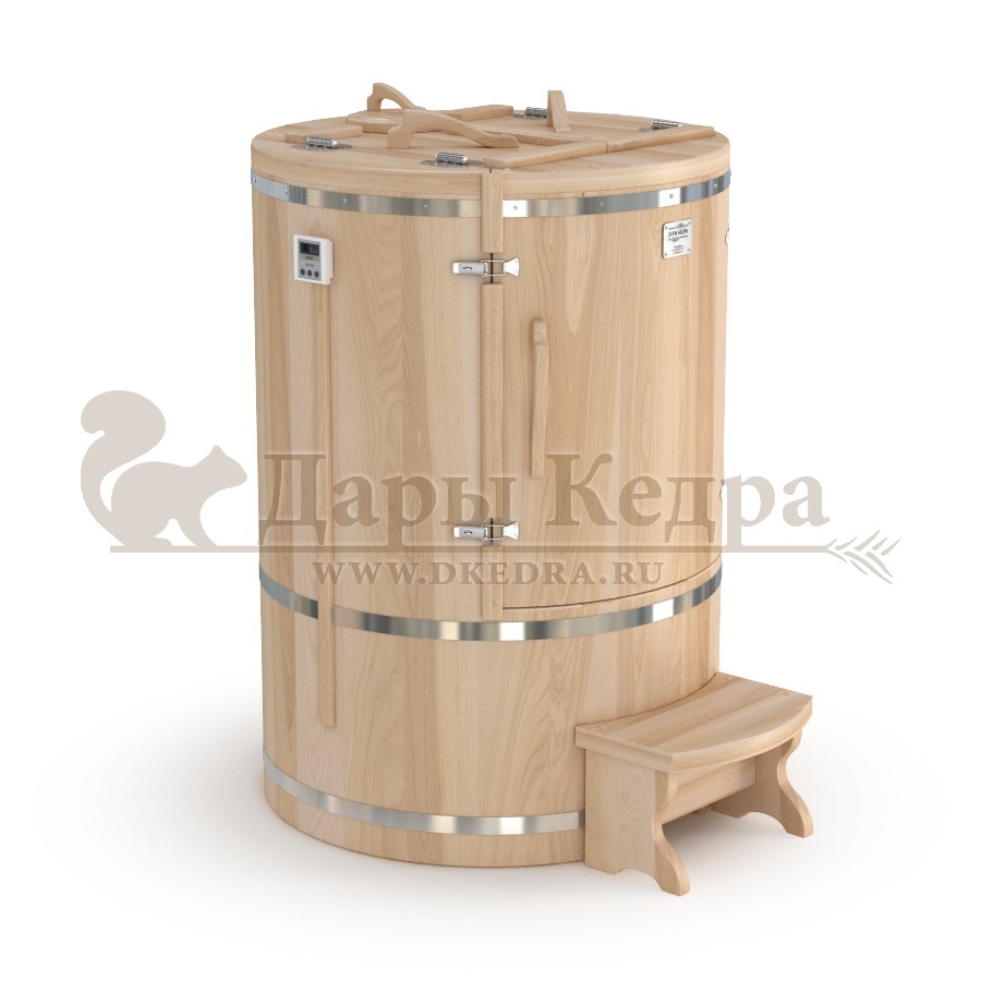 • Готовый комплект «Доступный»: кедровая бочка с парогенератором Готовый комплект - это полностью укомплектованный набор с фитобочкой для процедур парения. Круглая модель наиболее компактна и мобильна. Толщина стенок составляет 25 мм. Фитобочка оборудована откидными створками, дверцей и отверстием для головы. Во время парения человек сидит внутри кедровой бочки, а голова находится снаружи. Благодаря этому исключается возможность перегрева. Подлокотники из кедра, встроенные ручки на створках и двери делают эксплуатацию более удобной. Парение в фитобочке благотворно влияет на организм в целом: повышается иммунитет, выводятся шлаки и токсины, улучшается работа органов тела и состояние кожи.