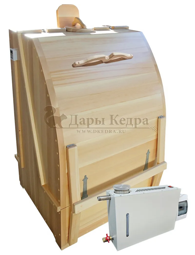 Готовый комплект «Универсальный»: кедровая бочка с парогенератором + био-защита изнутри и снаружи Готовый комплект - это полностью укомплектованный набор с фитобочкой для процедур парения. Овальная модель более просторна и удобна в использовании. Толщина стенок составляет 40-45 мм, что позволяет увеличить срок службы изделия. Верхний скос делает положение головы более комфортным и улучшает обзор. Фитобочка оборудована откидными створками, дверцей и отверстием для головы. Во время парения человек сидит внутри кедровой бочки, а голова находится снаружи. Благодаря этому исключается возможность перегрева. Подлокотники из кедра, встроенные ручки на створках и двери делают эксплуатацию более удобной. Парение в фитобочке благотворно влияет на организм в целом: повышается иммунитет, выводятся шлаки и токсины, улучшается работа органов тела и состояние кожи.
