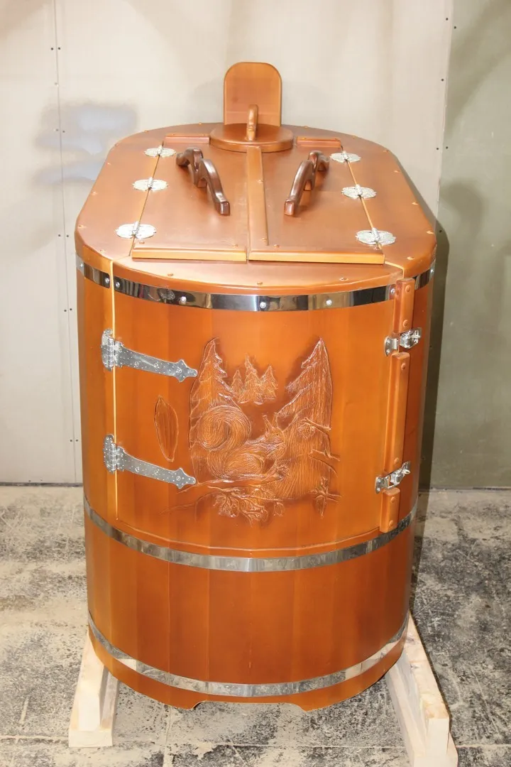• Кедровая бочка (фитобочка) «Олимпийский чемпион» Это эксклюзивная фитобочка любой модели и комплектации с резьбой вашего логотипа или фирменного знака. Просто приготовьте эскиз рисунка, и наши мастера перенесут его на изделие. Авторский рисунок на фитобочек придаст оригинальность вашему дому или салону красоты, подчеркнёт вашу индивидуальность и непревзойденный вкус. Художественная резьба это ручная работа, выполняется разными мастерами и каждый рисунок неповторим. Вы можете выбрать предложенные варианты резьбы или подобрать изображение и мы предложим вам подходящий эскиз. На сайте представлены наши работы в качестве примера. Каждая резьба рассчитывается индивидуально и может быть нанесена на любую модель фитобочки. Парение в фитобочке благотворно влияет на организм в целом: повышается иммунитет, выводятся шлаки и токсины, улучшается работа органов тела и состояние кожи. Обязательно обращайте внимание на размер дверных проемов вашего помещения. Если они меньше 78 см, то закажите разборную модель!