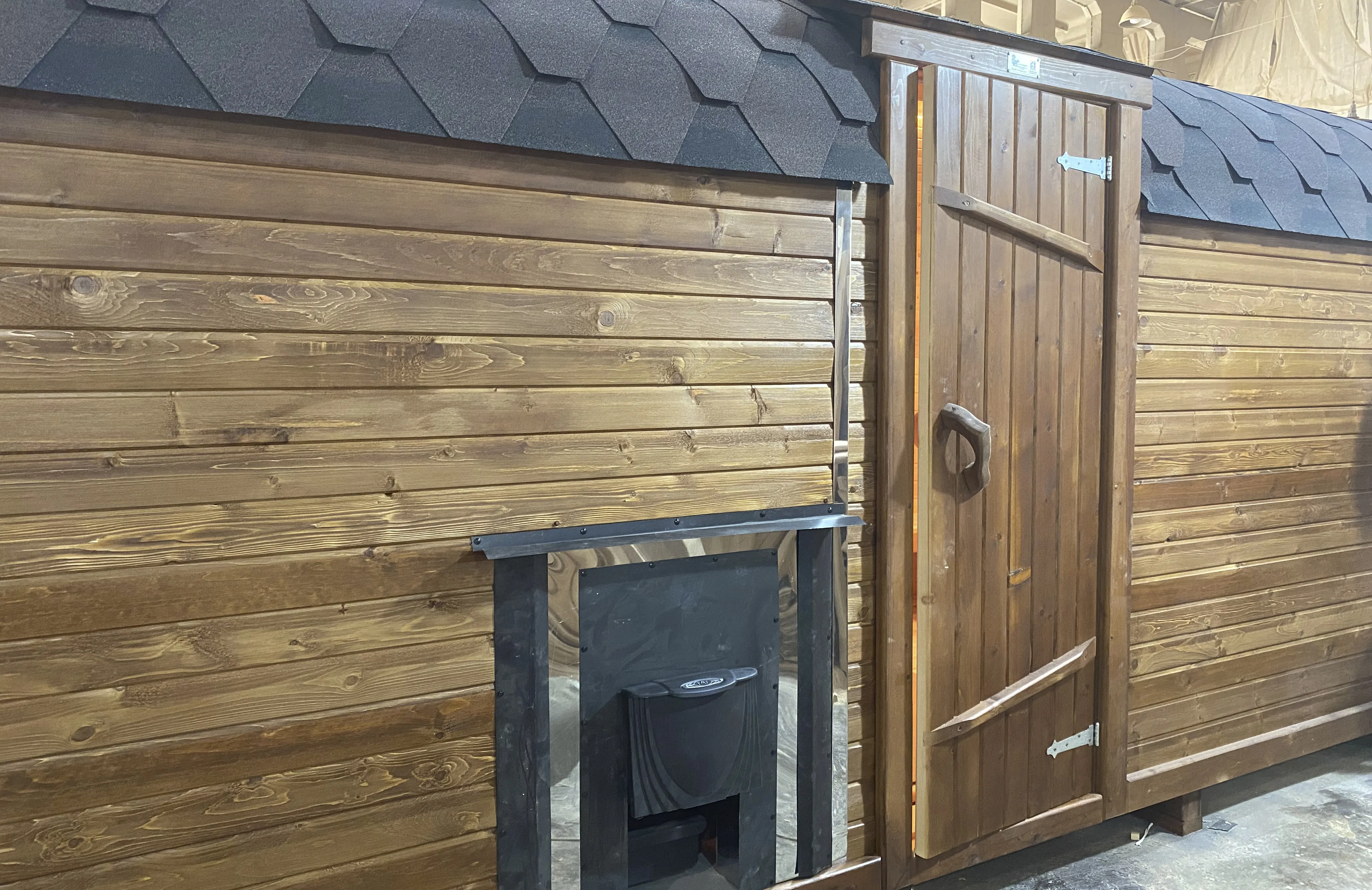 Домик с тремя помещениями подходит для дачного использования в теплое время года или обустройства загородных баз отдыха. Прихожая и кухня занимают одну комнату, в которой стоит стол из кедра. Две другие оборудованы четырьмя деревянными лежаками, по желанию их можно заменить на двуспальные кровати. Либо обустроить санузлом и душевой зоной. Для удобства пользования кемпинг дом можно укомплектовать верандой с лавочками или козырьком.