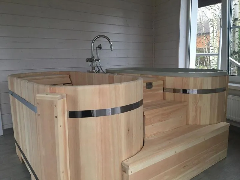 • Двойная овальная купель для бани из кедра Двойная купель из кедра чаще всего используется в крупных банных комплексах и оздоровительных центрах. Она представляет собой две овальные чаши для воды, в которых люди отдыхают после парения. Между купелями установлен широкий подиум из кедра, по которому могут спускаться и подниматься сразу несколько людей. Для комфортного отдыха купель оснащена лавочками и двумя дополнительными лестницами. Обручи из нержавеющей стали декорируют изделие и равномерно распределяют нагрузку воды во время пользования. При правильном уходе купель для бани не рассыхается и не подвергается гниению. При взаимодействии древесины кедра с водой активируются эфирные масла и фитонциды, благодаря чему организм насыщается полезными веществами.