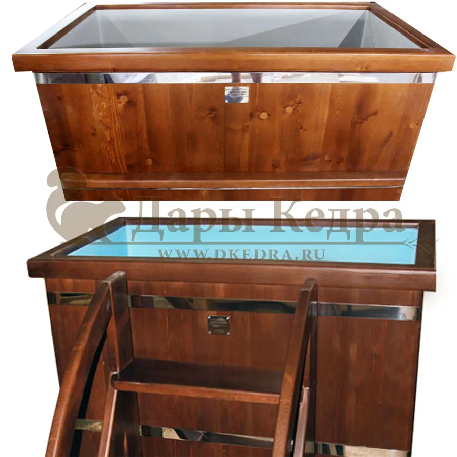 Это емкость для воды с прямоугольной пластиковой чашей. Купель предназначена для отдыха и охлаждения тела после процедур парения. Подходит для уличного и комнатного использования. Для удобства пользования овальная купель с пластиковой вставкой оснащена лавочками, приставной и внутренней лестницей из кедра.