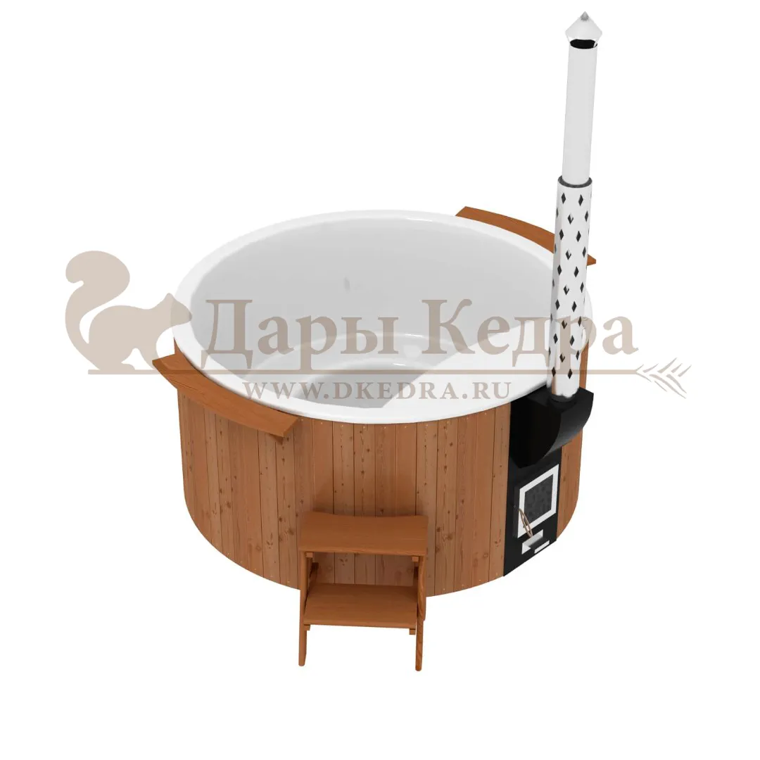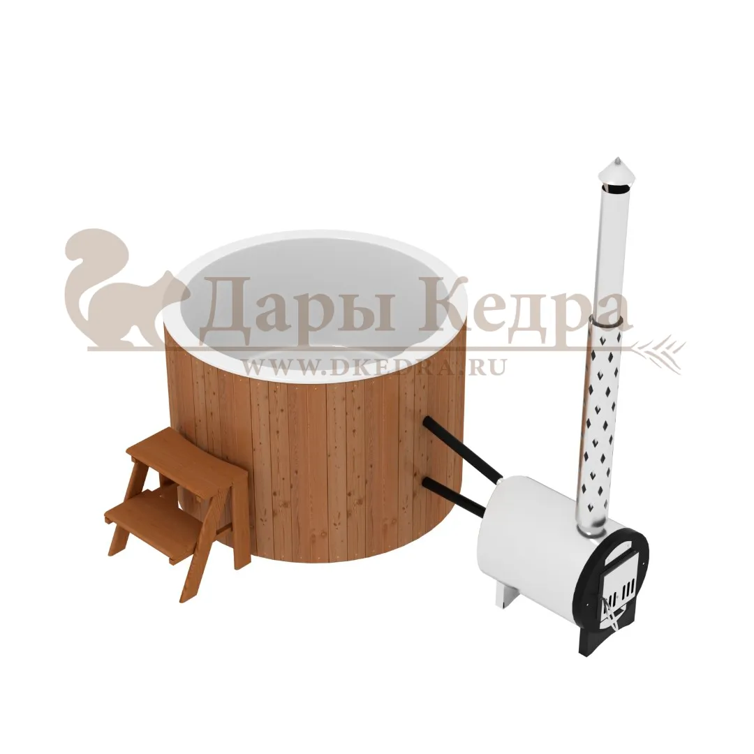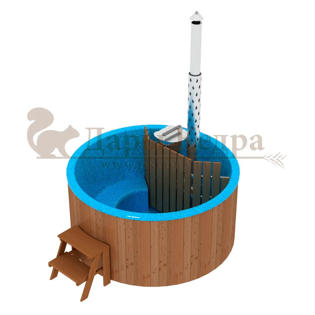 Финская круглая композитная купель с подогревом (с печкой) «Премиум 160 хот с печью 25 квт» Это уличная подогреваемая купель с круглой внутренней чашей, которая изготовлена из современного прочного и термоустойчивого материала (композита). Форма чаши обеспечивает комфортную посадку во время принятия процедур. Для удобства пользования купель оборудована приставной лестницей. Подогрев воды осуществляется внешней печью с дымоходом. Композитная вставка придает купели красивый внешний вид, продлевает срок службы и облегчает уход за изделием. Парение на свежем воздухе – это отличный способ укрепить здоровье и поддержать организм в тонусе.