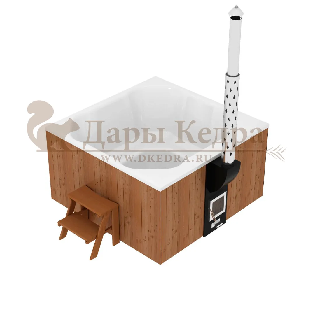 Финская квадратная композитная купель с подогревом (с внешней печкой) «кварта 200 хот 45 квт » Это уличная подогреваемая купель с квадратной внутренней чашей, которая изготовлена из современного прочного и термоустойчивого материала (композита). Форма чаши обеспечивает комфортную посадку во время принятия процедур. Для удобства пользования купель оборудована приставной лестницей. Подогрев воды осуществляется внешней печью с дымоходом. Композитная вставка придает купели красивый внешний вид, продлевает срок службы и облегчает уход за изделием. Парение на свежем воздухе – это отличный способ укрепить здоровье и поддержать организм в тонусе.