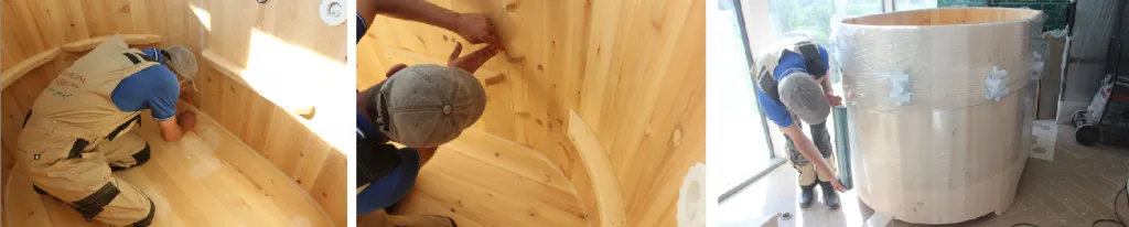 Купели из кедра могут быть разных форм и размеров: круглые, овальные, угловые, прямоугольные и квадратные. Каждая форма и размер предполагает свою схему сборки. Изделие доставляется в собранном виде, стянутая обручами. Перед началом сборки необходимо разобрать купель, занести по частям в помещение, где будет в дальнейшем она установлена, а далее осуществить сборку по месту.